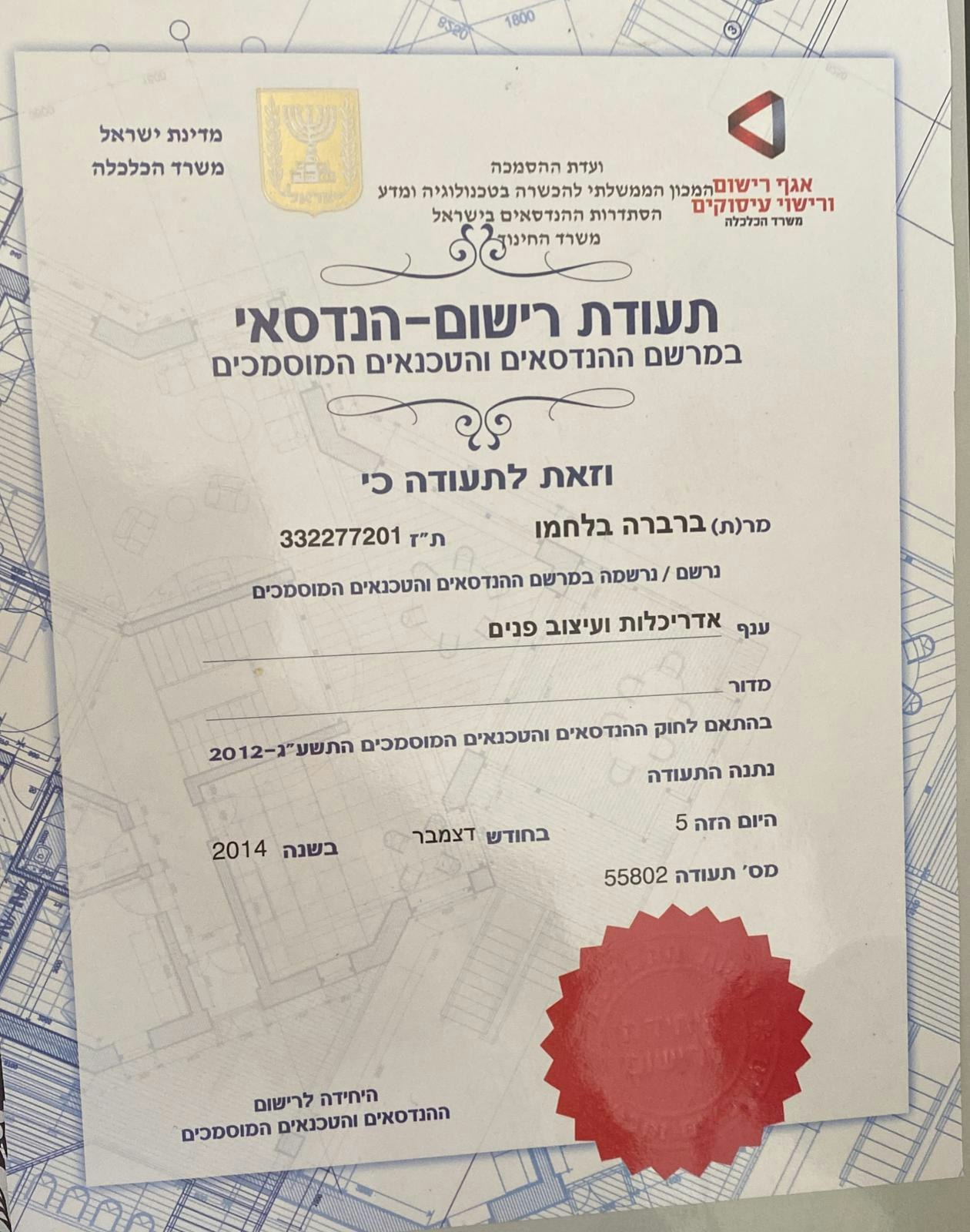 ברברה בלחמו, הנדסאית אדריכלות ומעצבת פנים בירושלים. בעלת תעודת הנדסאי אדריכלות מוסמכת ורשומה בפנקס ההנדסאים והטכנאים, החלה פעילותה משנה 2013 ומאז צברה ניסיון רב.