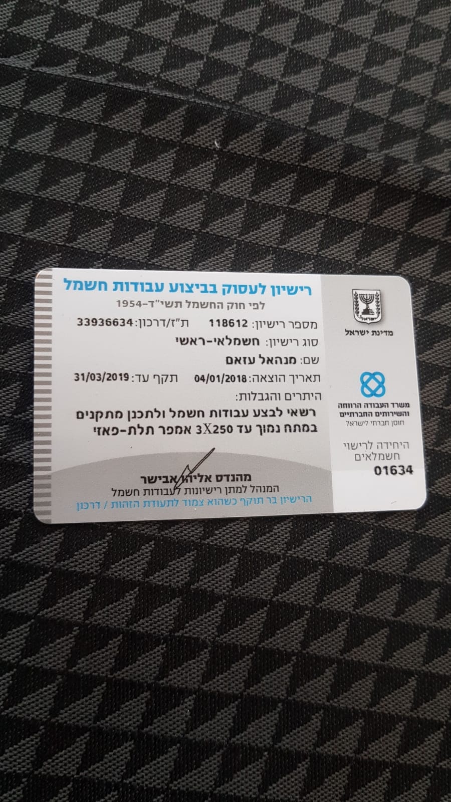 מנהאל עזאם, חשמלאי ראשי ובעל הרשאת חתימה בכאבול. בעל 11 שנות ניסיון בתחום. מבצע את כל סוגי עבודות החשמל ובפרט: התקנת גופי תאורה, נקודות חשמל, תיקון תקלות, לוחות חשמל וכו'.