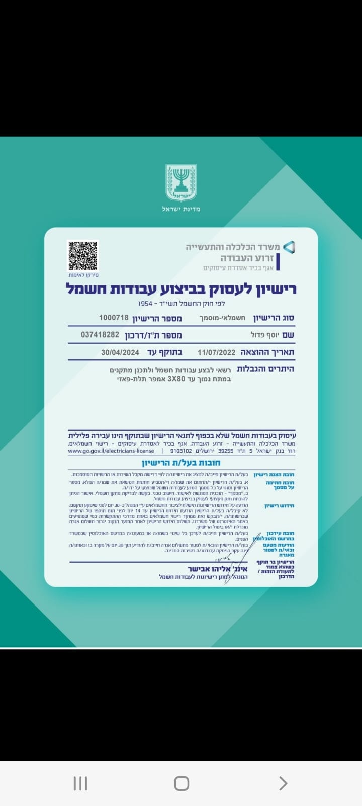 בעל רישיון והסמכה לביצוע עבודות חשמל, החלפת ותיקון לוחות חשמל, תיקון קצרים, תיקון דודי שמש, הוספת קווי ח...