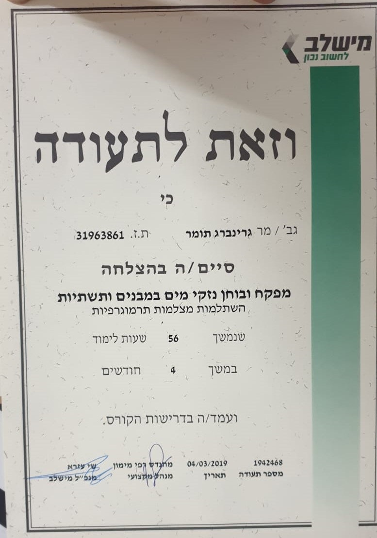 תומר גרינברג, אינסטלטור מוסמך במרכז ובאזור השפלה. אינסטלטור מוסמך המתמחה בצילום ואיתור נזילות בצנרת ללא הרס. מספק ומבצע את כל שירותי האינסטלציה- החלפת צנרת וקווי ביוב, איתור תקלות בשוחות ביוב ע"י מצלמת דחיפה, איתור נזילות ע"י גז, איתור נזילות ופיצוצים ע"י מצלמות טרמיות, שחרור סתימות ותיקון ליקויי אינסטלציה ללא הרס.