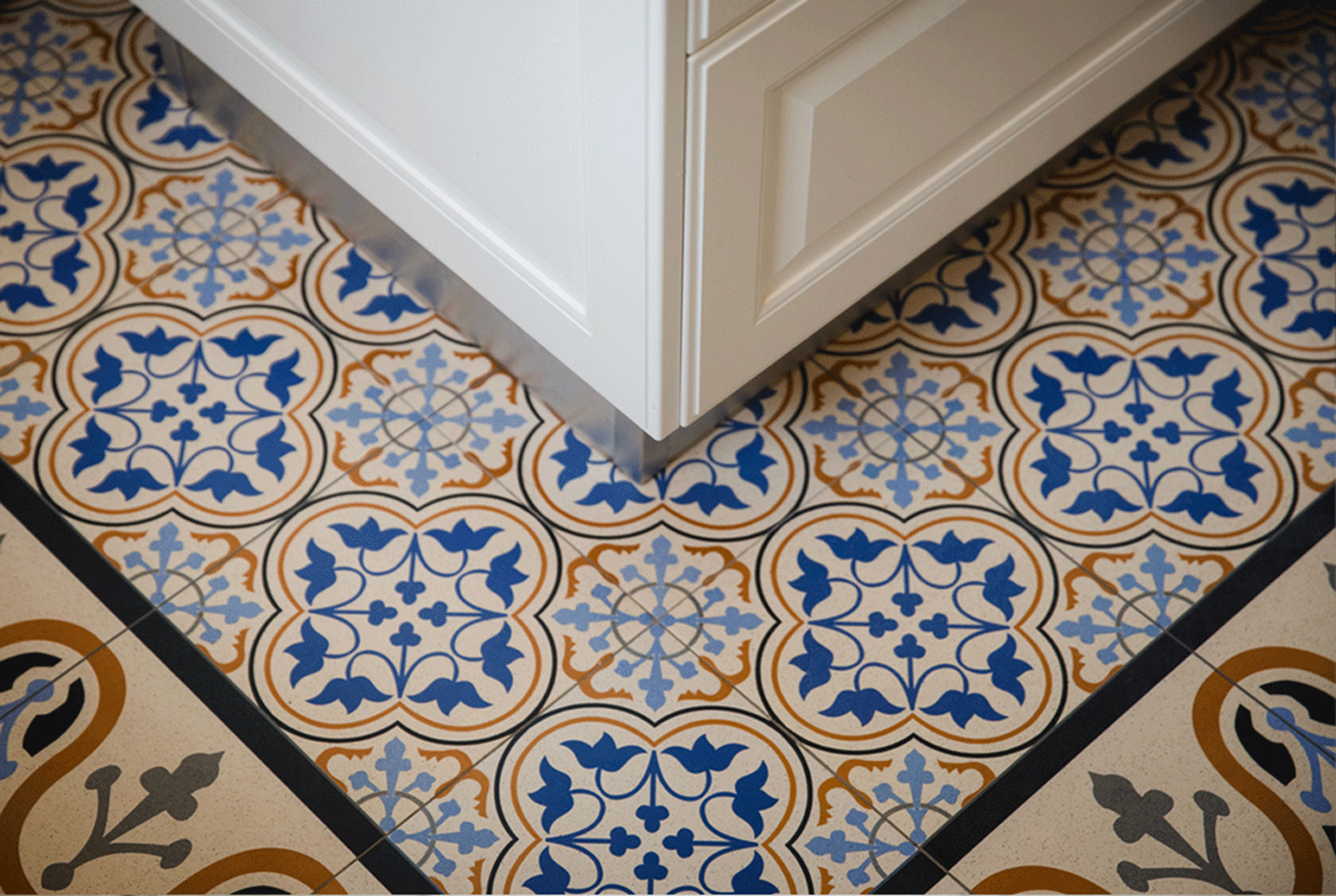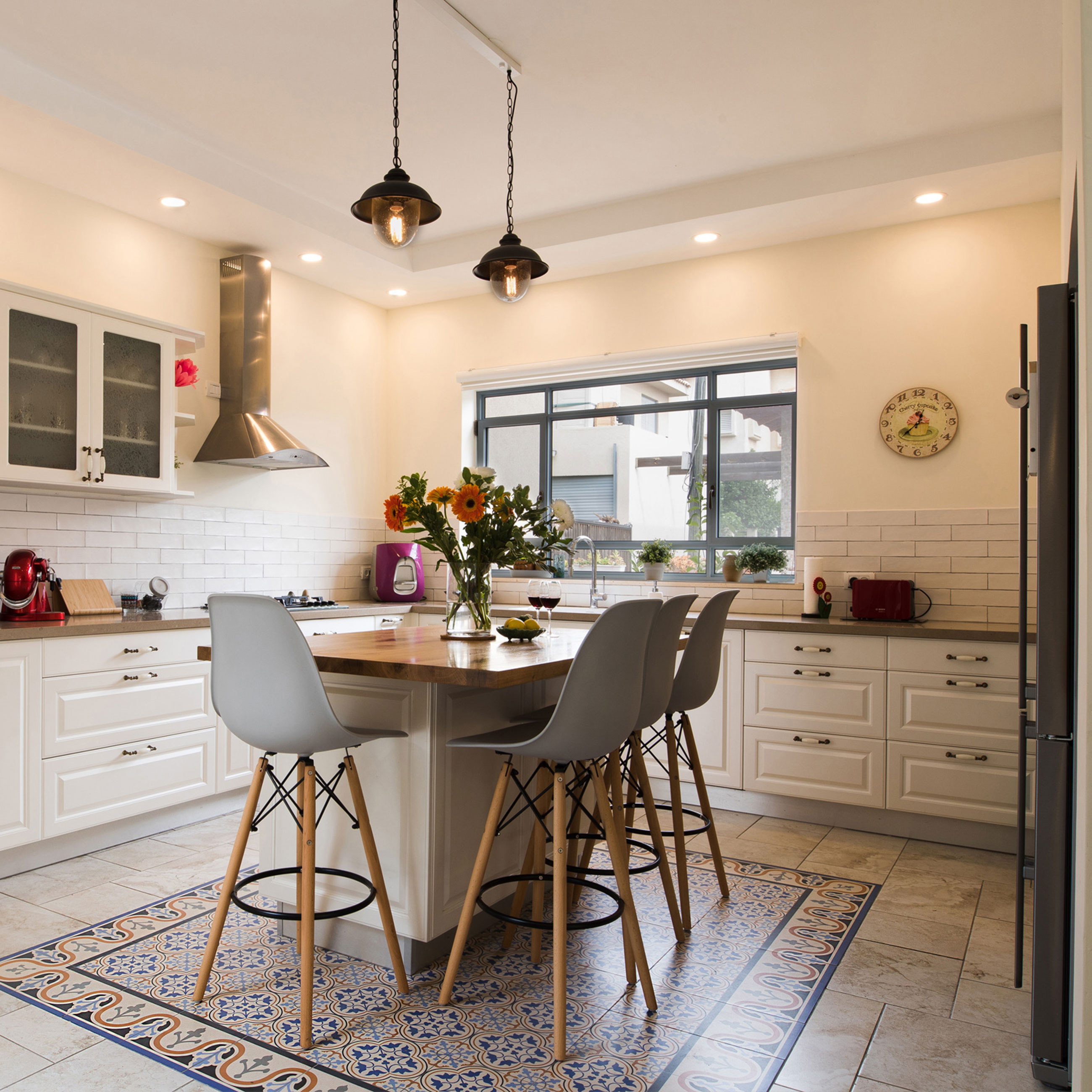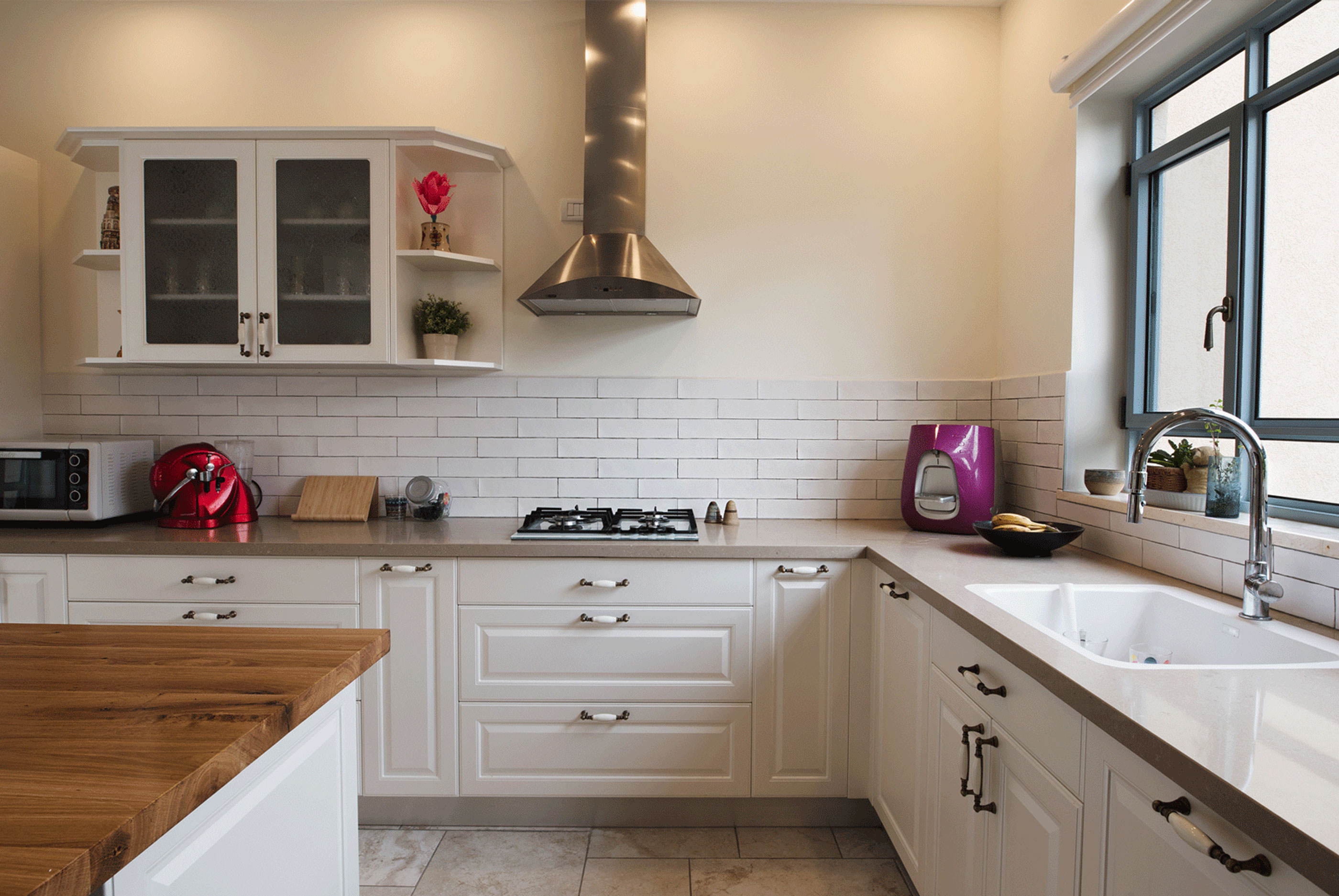 ההגיון הוא שחזיתות המטבח הם משטחים אנכיים ובהירים העשויים מעץ, בעוד המשטחים האופקיים (ריצוף, שיש) הם חומרים העשויים מאבן ובעלי גוון כהה יותר המשלים את החזיתות.