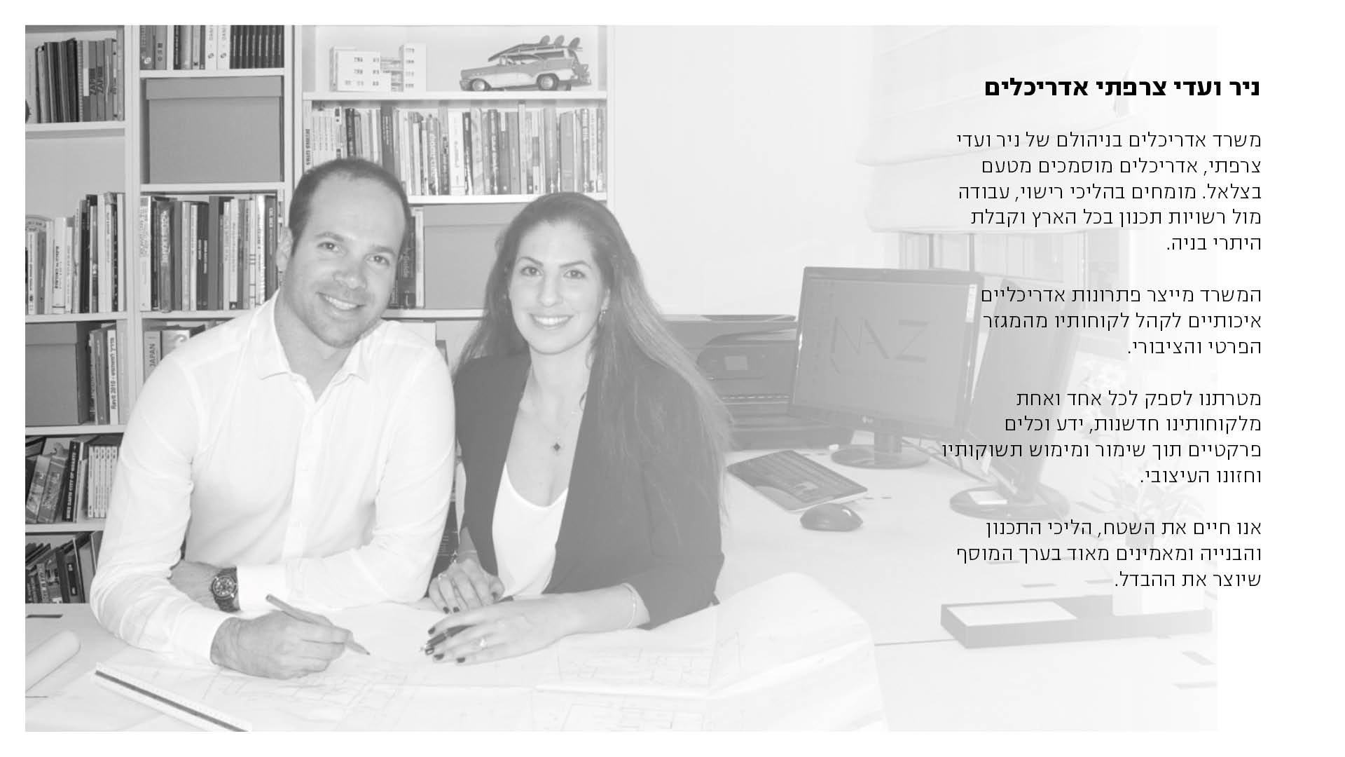 משרד אדריכלים בניהולם של ניר ועדי צרפתי, אדריכלים מוסמכים בוגרי בצלאל. מומחים בהליכי רישוי, עבודה מול רשויות תכנון בכל הארץ וקבלת היתרי בניה. המשרד מייצר פתרונות אדריכליים איכותיים לקהל לקוחותיו מהמגזר הפרטי והציבורי במגוון תחומים, ביניהם: * בניה פרטית - תכנון בתים פרטיים * הליכי רישוי - עבודה מול רשויות, תכנון הליכי רישוי וקבלת היתרי בניה * התחדשות עירונית - תמ"א 38 ופינוי בינוי * הכנת תב"ע - ליווי מלא ליזמים משלב תכנון ראשוני ועד לאישור התב"ע * משרדים וחללי עבודה - תכנון ועיצוב פנים לחברות ולקוחות פרטיים * עיצוב פנים - תכנון וייעוץ אדריכלי החל מחלוקת החלל ועד לבחירת חומרי הגמר מטרתנו לספק לכל אחד ואחת מלקוחותינו חדשנות, ידע וכלים פרקטיים תוך שימור ומימוש תשוקותיו וחזונות העיצובי. אנו חיים את השטח, הליכי התכנון והבנייה ומאמינים מאוד בערך המוסף שיוצר את ההבדל.