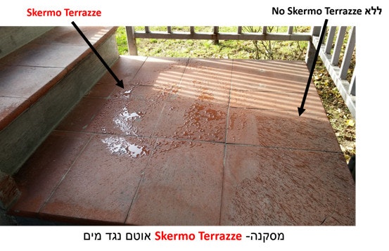 SKERMO TERRAZZE הוא מוצר מגן ודוחה מים ששורד לאורך זמן. ניתן ליישם אותו על ריצוף חוץ כגון קרמיקה, אבן חול, חרסינה והוא מסוגל לבלום את חדירת מי הגשם דרך אזורים נקבוביים או פגומים. המוצר אינו משפיע על מעבר האוויר ועל המראה החיצוני של המשטחים המטופלים. בנוסף, מניעת חדירת המים גם מונעת היווצרות עובש, טחב, אצות, חזזיות וחיידקים.