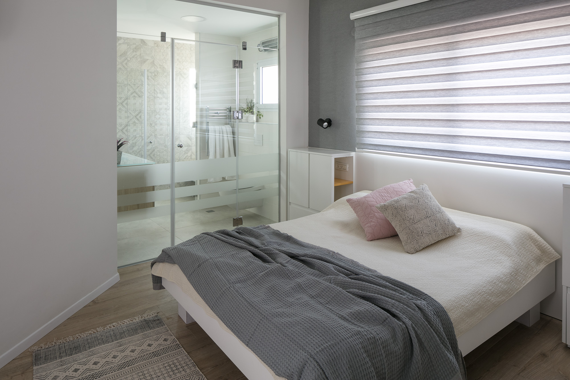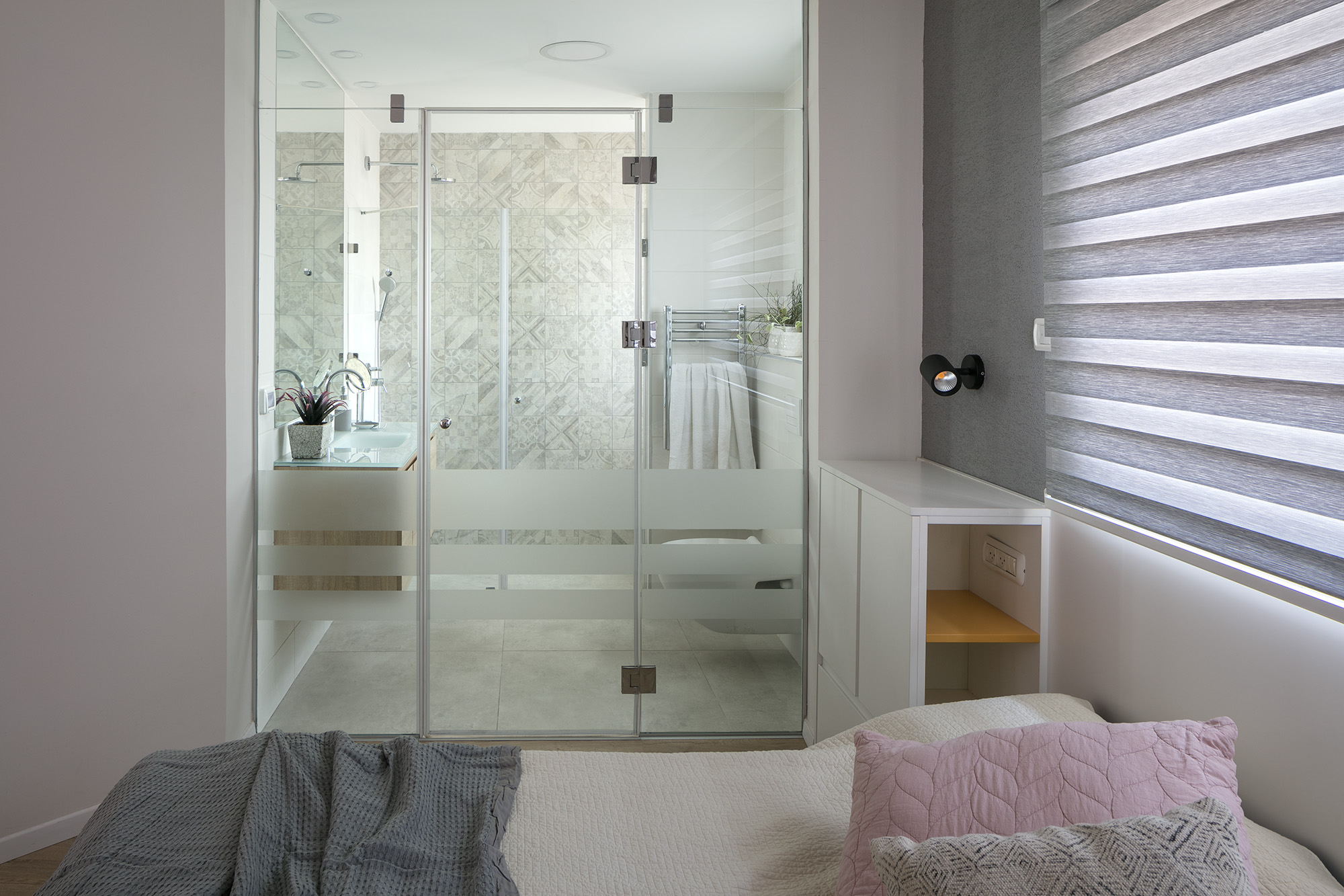 הקיר התוחם את חדר הרחצה הוחלף במחיצת זכוכית, כך ששני החדרים נחווים כאחד