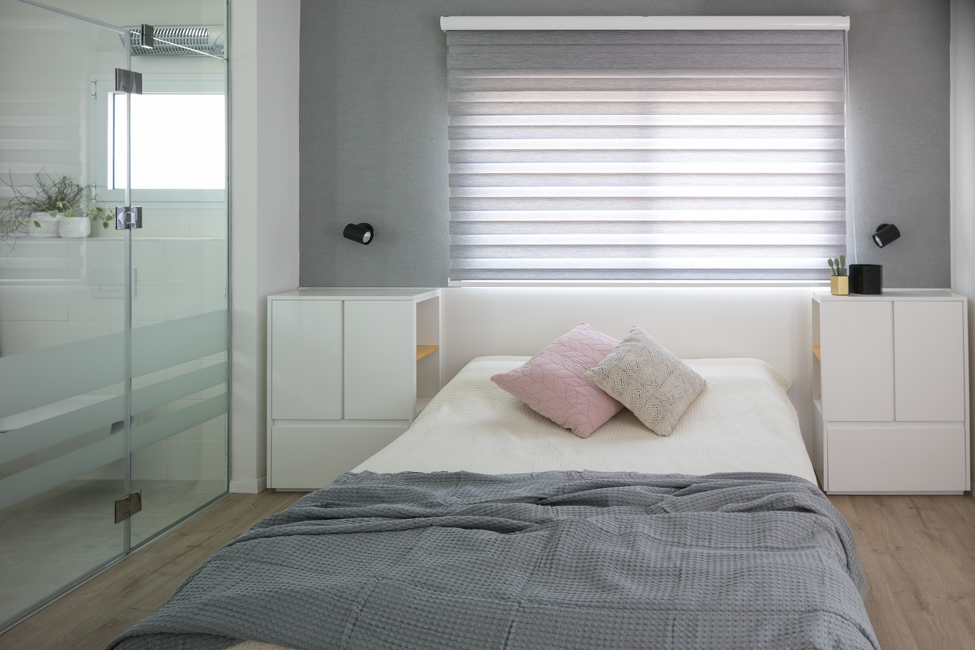 חדר השינה של בני הזוג בצבעים בהירים וניטרליים וסטיילינג מינימליסטי