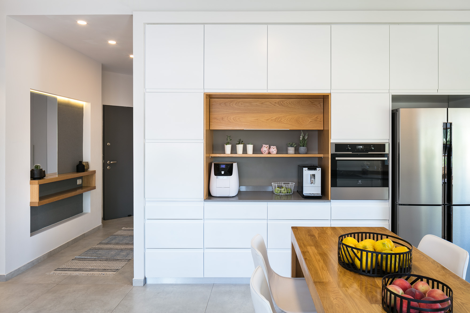 משטח עבודה ודלפק אוכל אל מול קיר ארונות גבוה ובו נישת שירות. במרכז קיר נוסף המודגש בעזרת טקסטורה וצבע