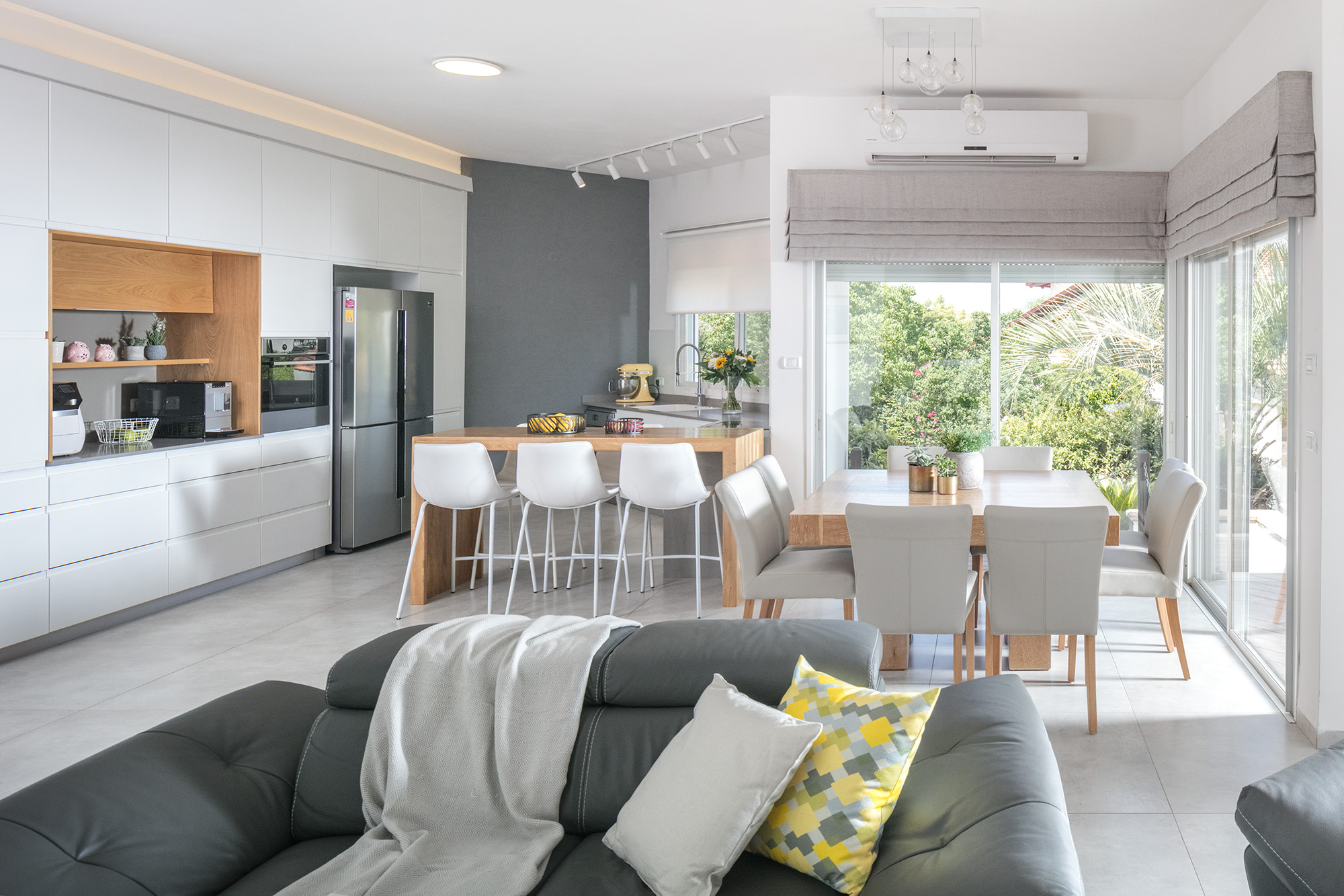 מטבח, פינת אוכל וסלון המתפקדים כחלל בעל שפה עיצובית אחת באפור, עץ ולבן