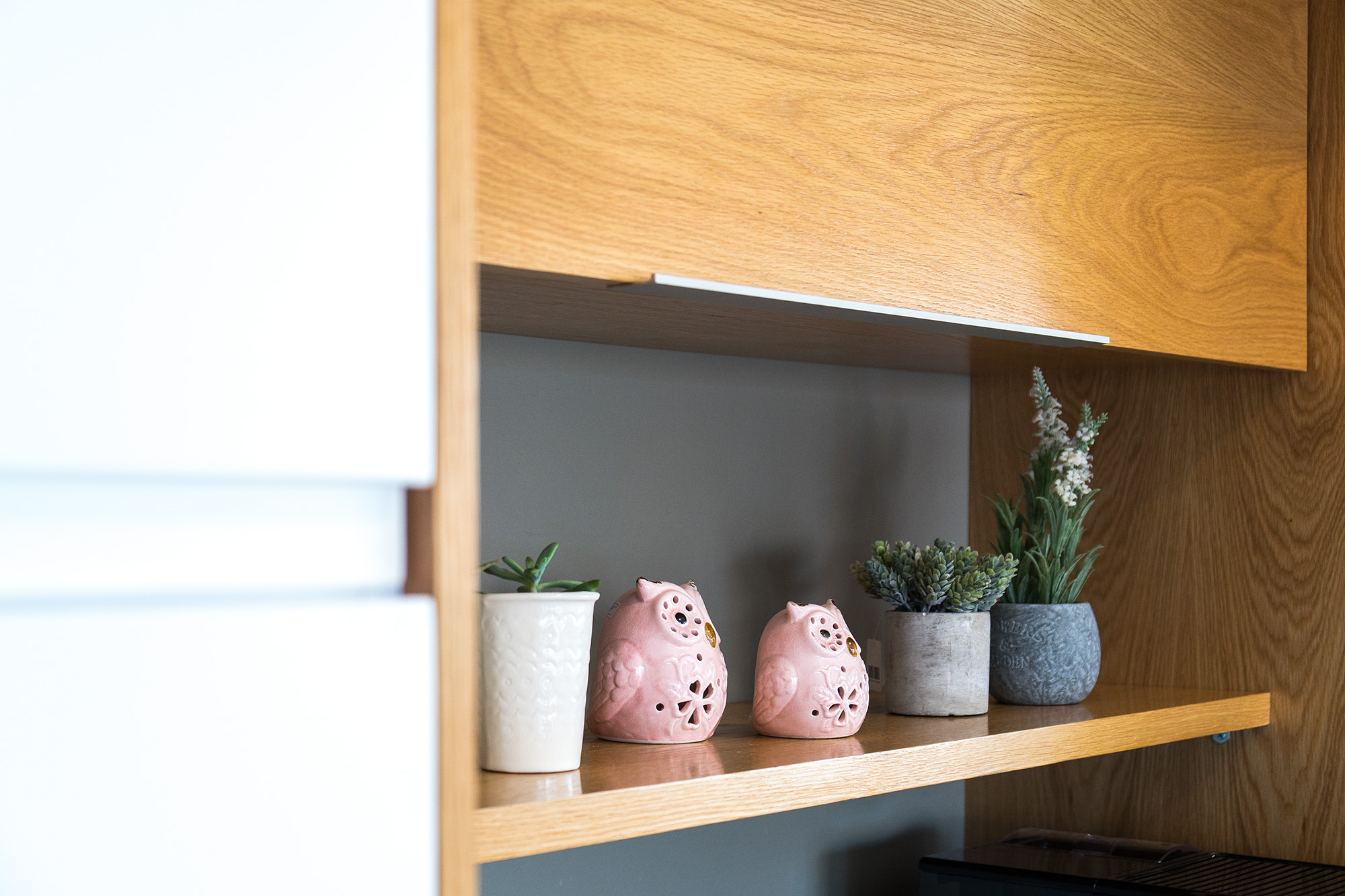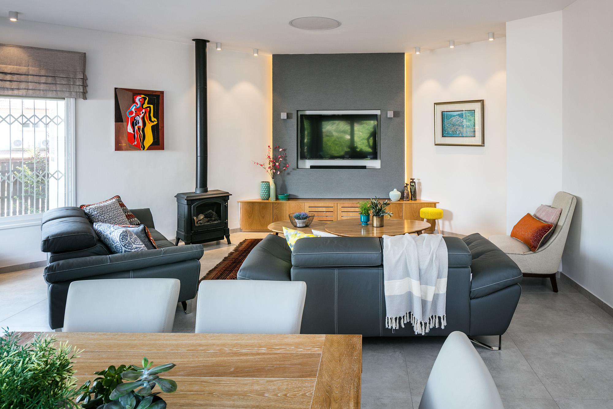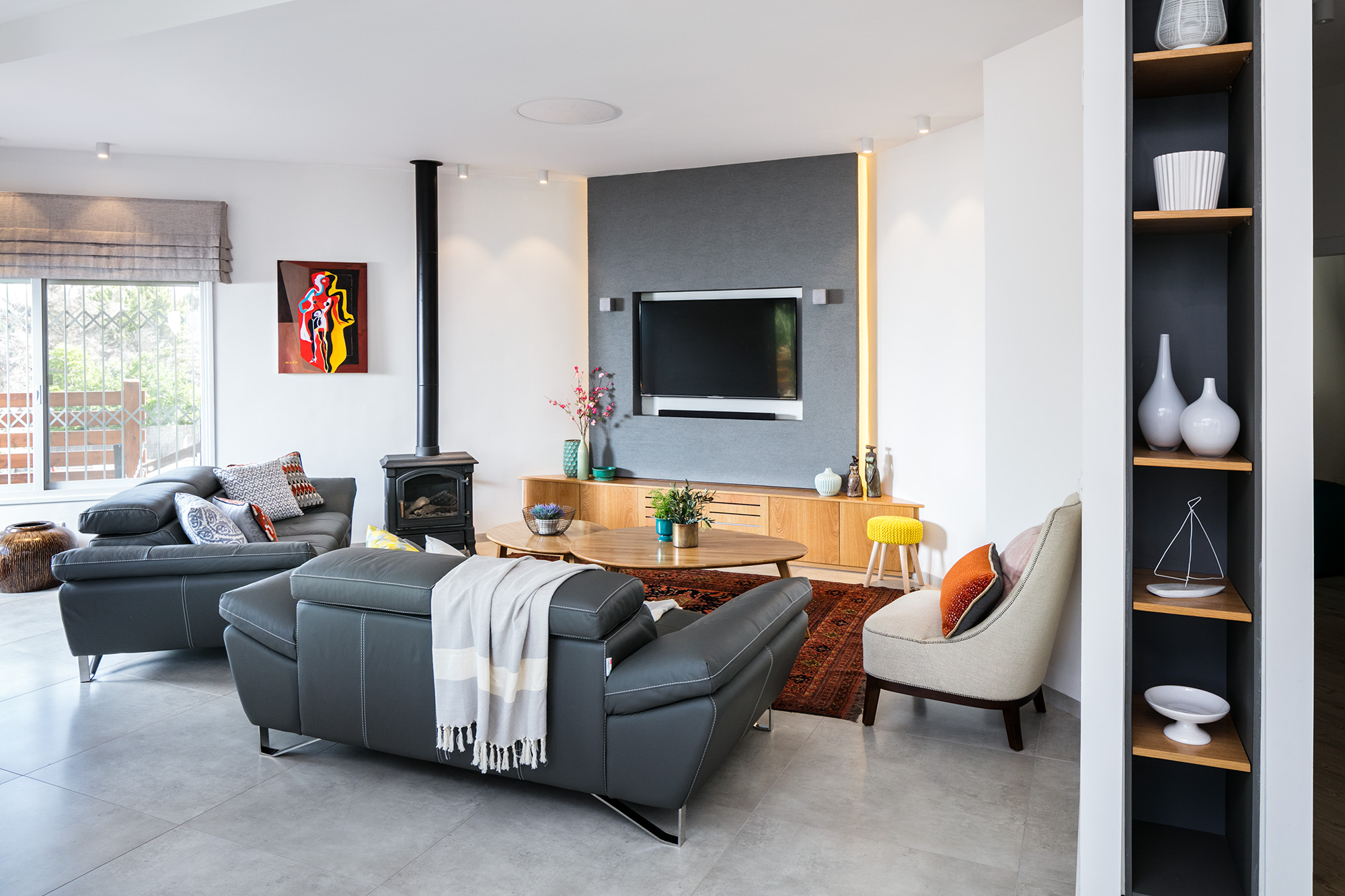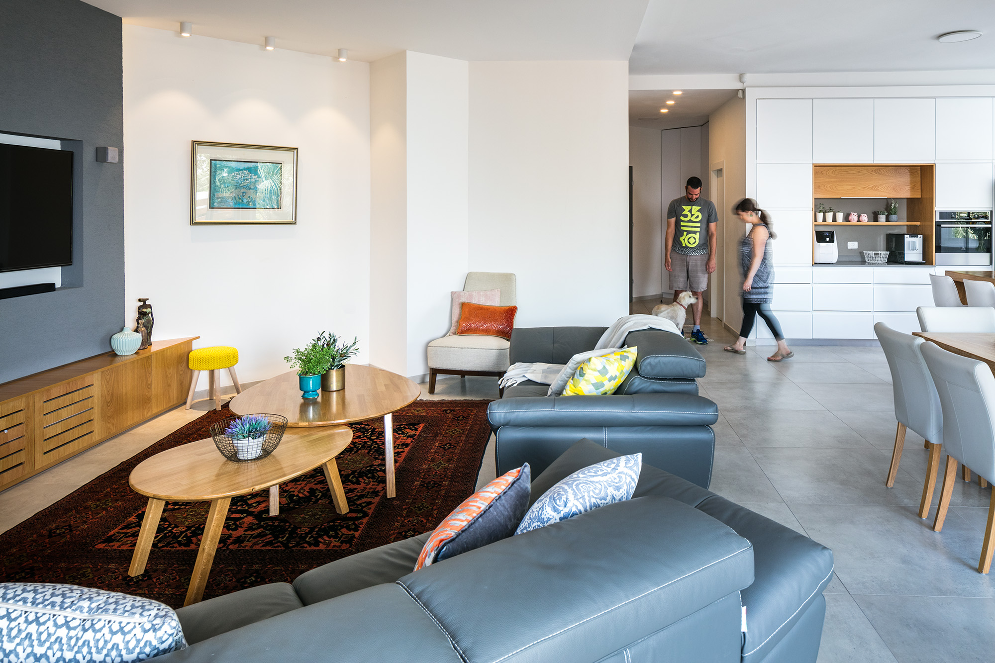מיקום הסלון וכיוון ההפניה שלו הוגדרו מחדש, תוך ניצול מקסימלי של ממדי החלל. נישה דקורטיבית, הממשיכה את השפה העיצובית של קיר המדיה, מגדירה היטב את הגבול שבין הסלון למסדרון
