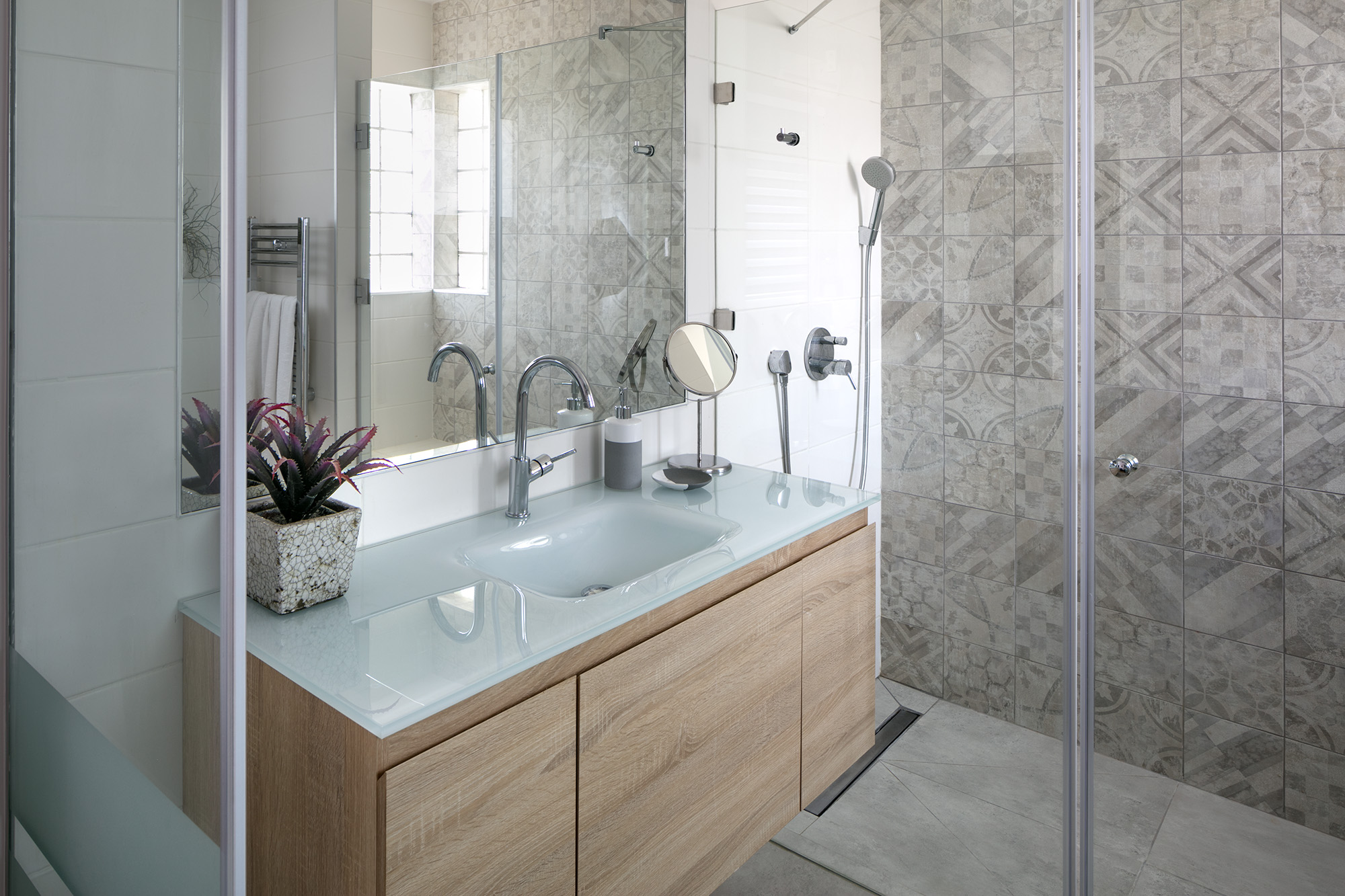 אריחים אפורים ולבנים יוצרים מפגש חומרים נקי ונעים בחדר הרחצה.