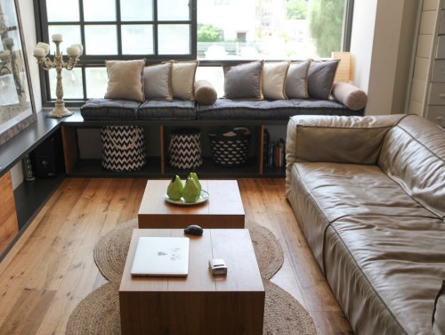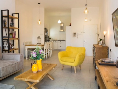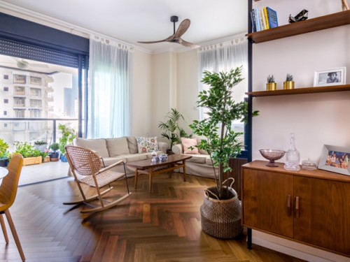 בזמן שהדיירות שהו בחו"ל עוצבה מחדש דירת הגן שקנו בסגנון המשלב קו מודרני עם רהיטי עץ גולמיים ונגיעות של צבע