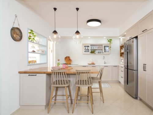 דירת חמישה חדרים בנתניה עוצבה בצבעים שקטים ובשילוב חומרים טבעיים כאשר המטבח נתן את הטון לבית כולו