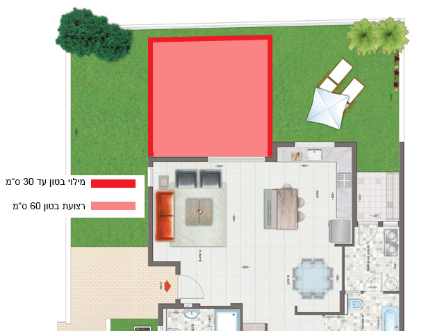 יש להכין רצועה של חצי מטר מסביב ובאמצע לצקת 20-30 ס"מ כמובן בסטדנרטים של היום רשת פלדה שצריך לחבר לבניין כדיי שלא יזוז ולא ישקע.