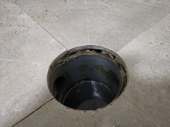 כשהמקום נחשף, ראיתי שהקופסה לא מגיעה עד הריצוף - אני מניח שהדבר הזה לא תקין. בנוסף, בחלל בין הקופסה לריצוף יש חורים (גם חסכו על דבק קרמיקה).