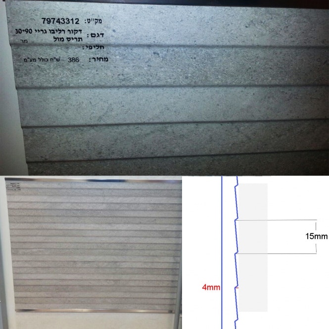 מצורפות תמונות של האריח המדובר (מידתו 30 על 90 סמ) ושרטוט הפרופיל שלו. עומק המדרגות באריח הן 4 מ"מ.