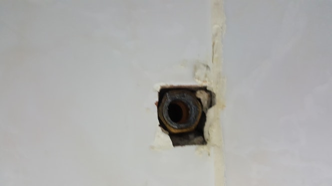 רואים את הצינור שיוצא מהקיר ויש חתיכה של הברגה שנשברה בתוכו.