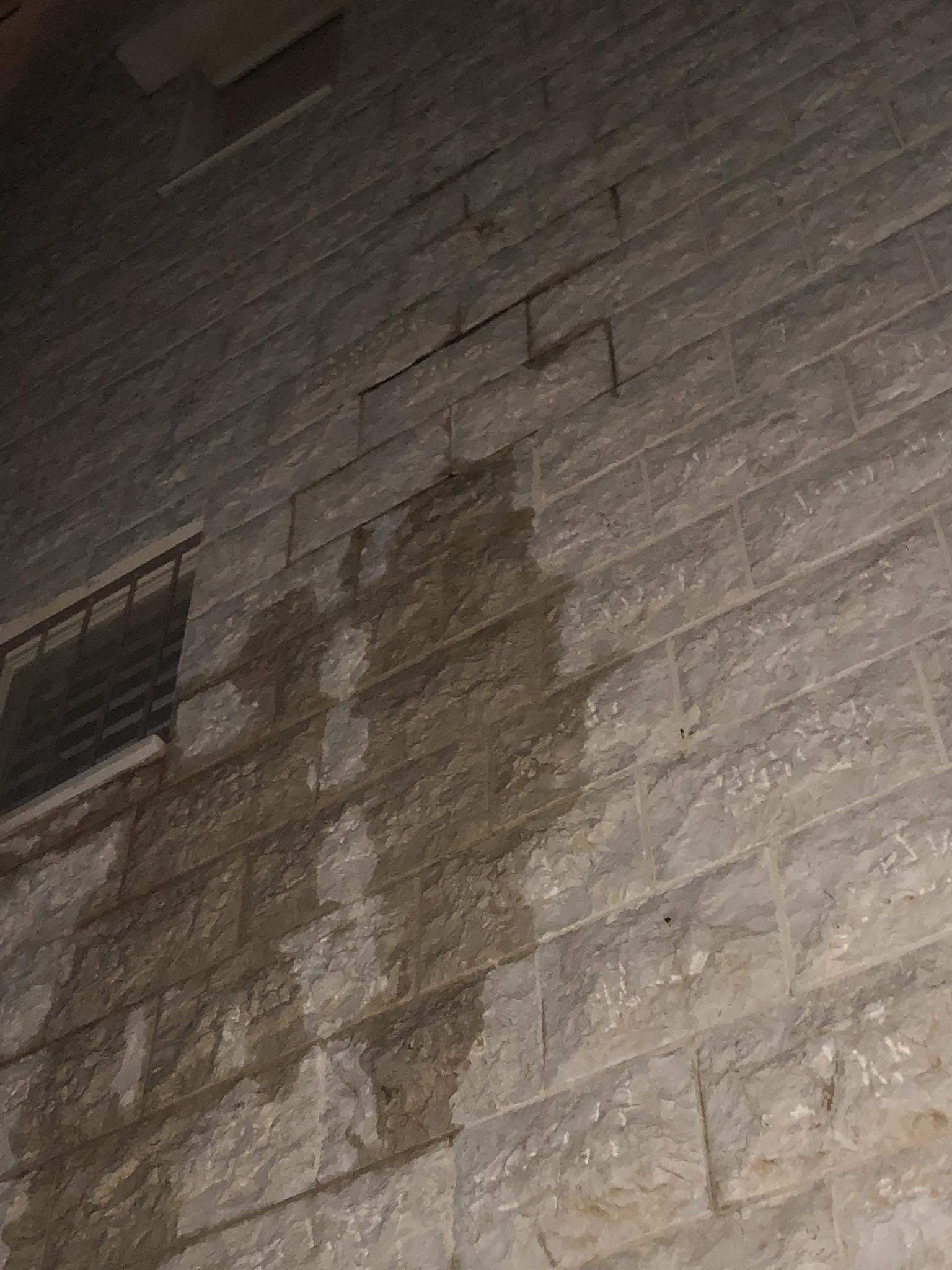תסתכל טןב טוב ברובה מעל .... יש מעל מקלחת כניראה (לפי החלון) שניראה שיורד מים מרצפה שם אל הקיר החיצוני תראה מצב זה גם בימים ללא גשם