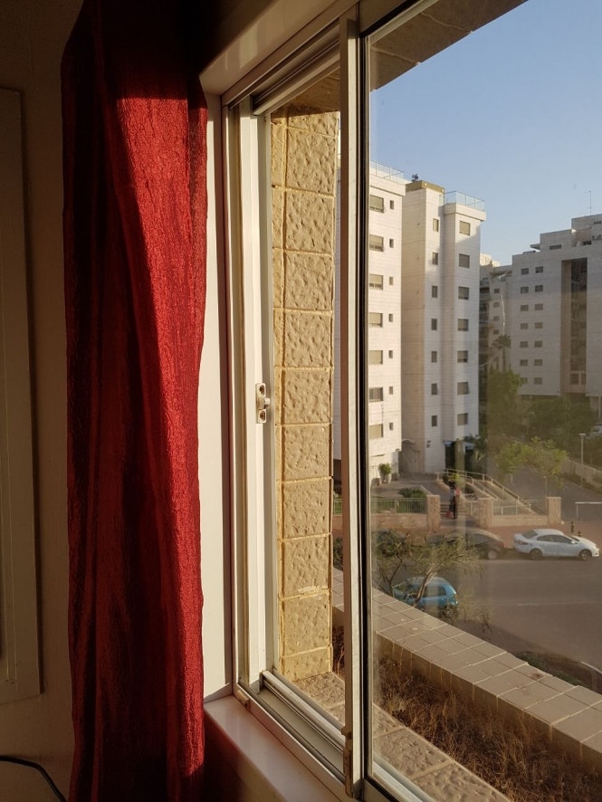 היי, חלון כיס עם זכוכית חד-שכבתית ותריסי פלסטיק, דרכם חודר רעש מהכביש מתחת לבית (בעיקר משאיות ואופנועים).