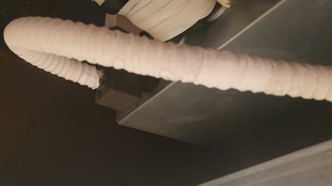 לאחר בערך שעה של עבודה אני רואה שמתחילה להיות "הזעה" (לחות) מסביב לצינור ניקוז המים של היחידה הפנימית (הפלסטיק הלבן) ויותר מאוחר כבר יש טיפות (לא רק בתחילת הצינור אלא גם בהמשכו) שנוטפות על תקרה הגבס.