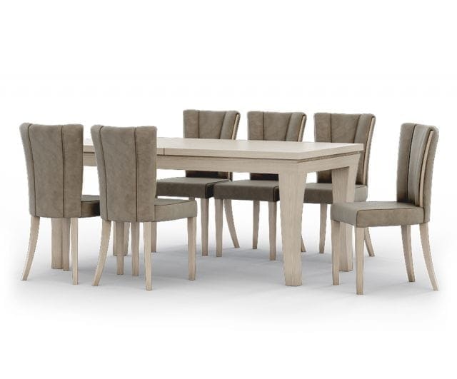 בחרתי פינת אוכל שהשולחן בצבע אלון מולבן והכסאות משולבות עץ מולבן עם ריפוד דמוי עור בצבע קפוצינו (מעין חום )