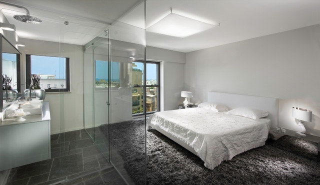 קיר זכוכית בין חדר השינה וחדר האמבטיה