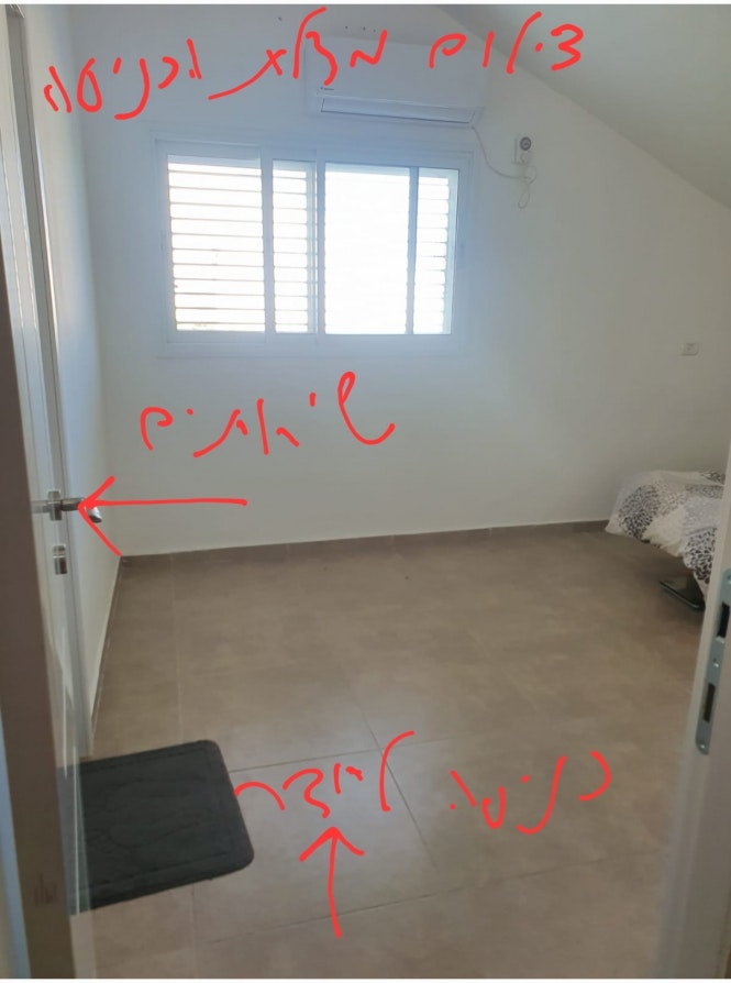 חדר השינה בצורה מלבנית 450x3.15 ,כאשר דלת הכניסה היא בקצה אחת הצלעות הארוכות וממול הכניסה יש חלון יחיד שמכניס אור טבעי לחדר. בצלע הקצרה שליד דלת הכניסה יש דלת נוספת לחדר שירוים ומקלחת, ובהמשך אותו הקיר יהיה ארון בגדים שלצערי יסתיר קצת חלק מהחלון.