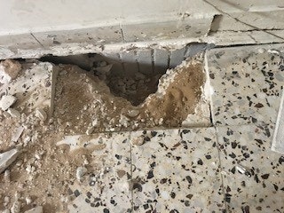 לאחר הסרת הריצוף גילינו שיש רצפת בטון שלא קשורה לקירות כי למעשה גבוהה מהקורה הראשונה שנמצאת בגובה פני הקרקע (רצפת הבטון נמצאת מול בלוקים שפה ושם נראה שהיה נסיון לקשור לבלוקים) מבורות קטנים שיצרנו נראה שפה ושם יש חללים מתחת לרצפת הבטון.