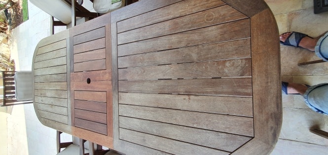 שלום הראל, לפי מה שראיתי מדובר בשולחן חוץ מעץ , מומלץ לשייף אותו ולצבוע עם ורנית על בסיס טרפנטין .