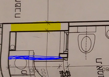 אנחנו מעוניינים להתחיל שיפוץ במקלחת ובמרפסת שירות. חלק מהשיפוץ כולל הזזת קיר, מסומן בצהוב בתמונת התכנית לעבר המיקום המסומן בכחול. (כ-מטר אחד ממיקומו המיקורי)