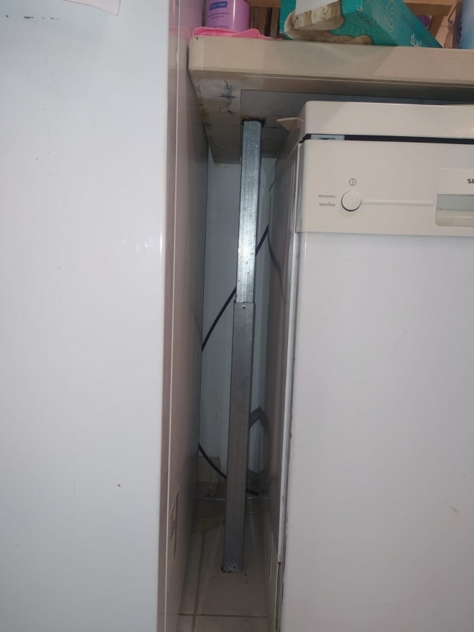 הארון לצד המדיח נראה שהוא רקוב מאחור וכנראה לא תמוך טוב בשיש. אני משער שבגלל זה הוסיפו עמוד תמיכה.(מדובר בדירה שכורה הבעלים לא מבין ולא מענין אותו מאני יעשה )