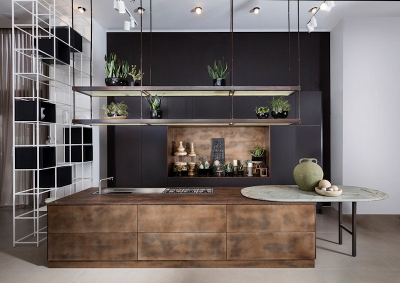 המטאליות נכנסת גם למטבח הנחושת, המורכב מחזיתות אלומיניום, מדמה עננות נחושתית, ומשולב זכוכיות בגוון שוקולד עמוק ודרמטי. המשטח המרחף עשוי גרניט פורצלן עם הטבעות נחושת, דבר היוצר מראה טבעי.