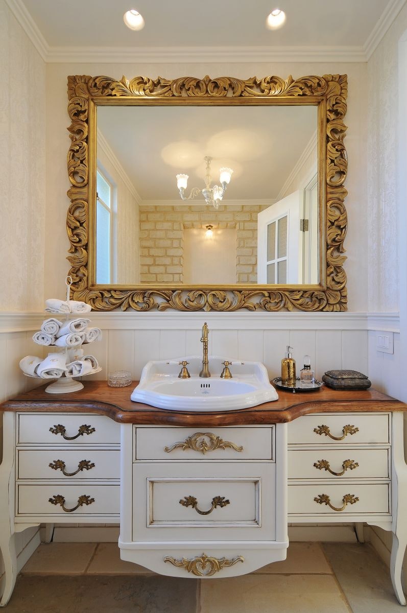 שימוש בחומרים כמו עץ, פליז וגוונים חמים, בהם השמנת והזהב, מוסיפים אלגנטיות כפרית וחמימה לחלל הרחצה. הידיות והמראה נוכחות בחלל לצד אקססוריז קטנים וגדולים.