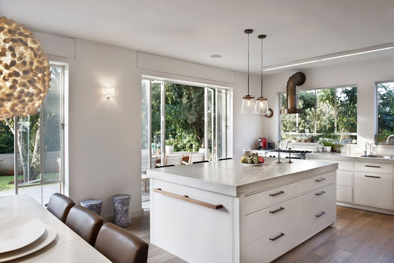 המראה מטאלי מתחבר גם לסגנון המודרני, כאן בנגיעות תעשייתיות במטבח שעוצב בפתיחות. חלונות ענק מכניסים את הגינה לבית, והגוונים הבהירים מבליטים את חמימות פרקט העץ, את גופי התאורה בגימור פליז ואת קולט האדים.